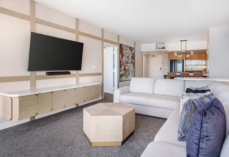 The separate living area has a queen sofa bed, wine station with wine refrigerator, 65-inch TV, sound bar, projector system, and washer/dryer. The waterfall dining area has seating for 6. The fully equipped kitchen is complete with refrigerator, convection oven microwave, dishwasher, stove, toaster, coffeemaker and utensils. Sleeps 4.