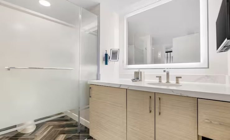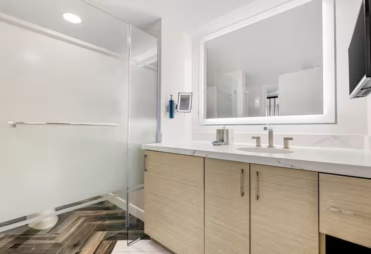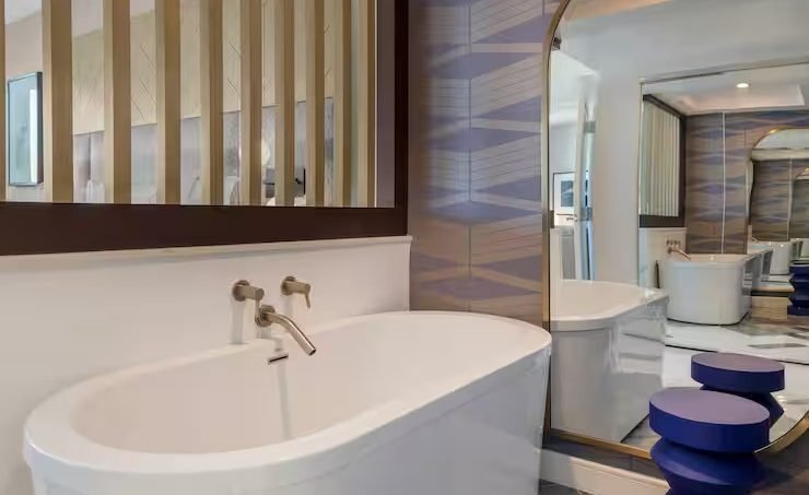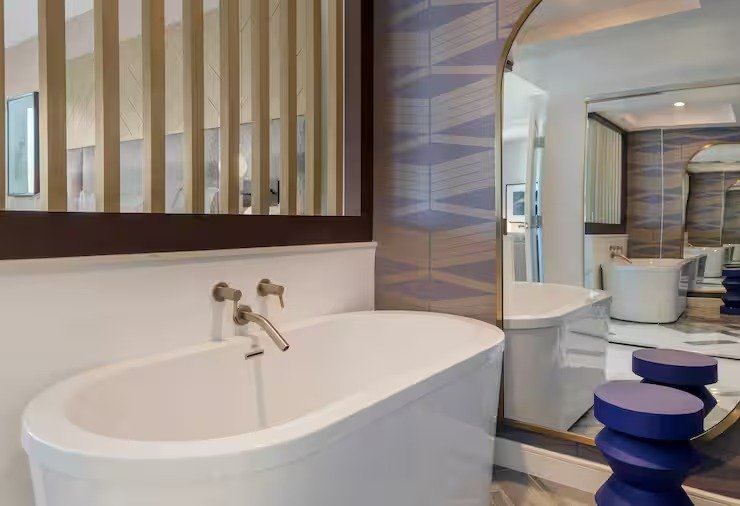 This one-bedroom suite is equipped with luxury furnishings and features a king bed, work desk, and 65-inch TV. The bathroom has a soaking tub and separate shower.