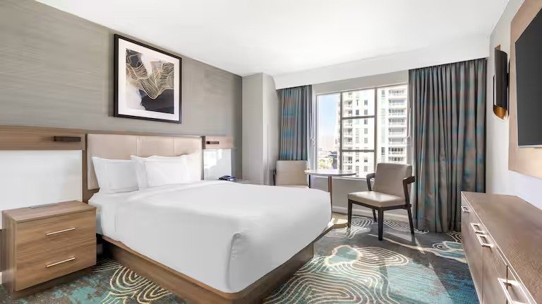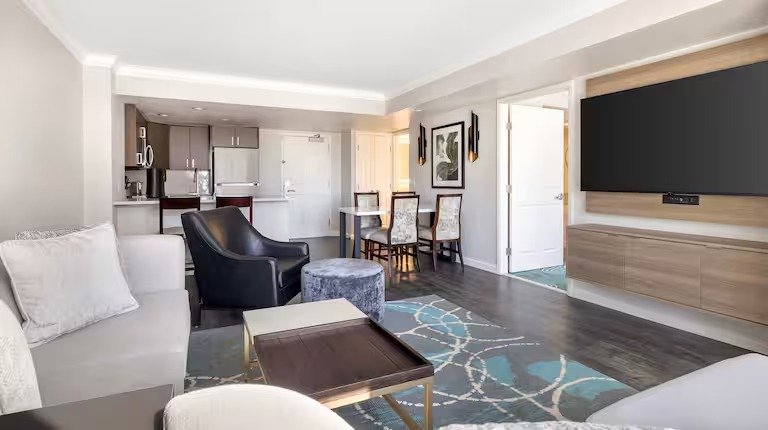 Hilton Grand Vacations on Paradise offers spacious studio, one-, and two-bedroom accommodations. One- and two-bedroom suites are complete with everythingyou would expect from a Hilton resort: a full kitchen, washer/dryer, high-speed wireless Internet access, air conditioning, and whirlpool jet tub in the master bathrooms. Studio units sleep two with a king-size bed; one-bedroom units sleep four with a king bed and queen sleeper sofa; two-bedroom units sleep eight six with king beds in both bedrooms, and a queen sleeper sofa.